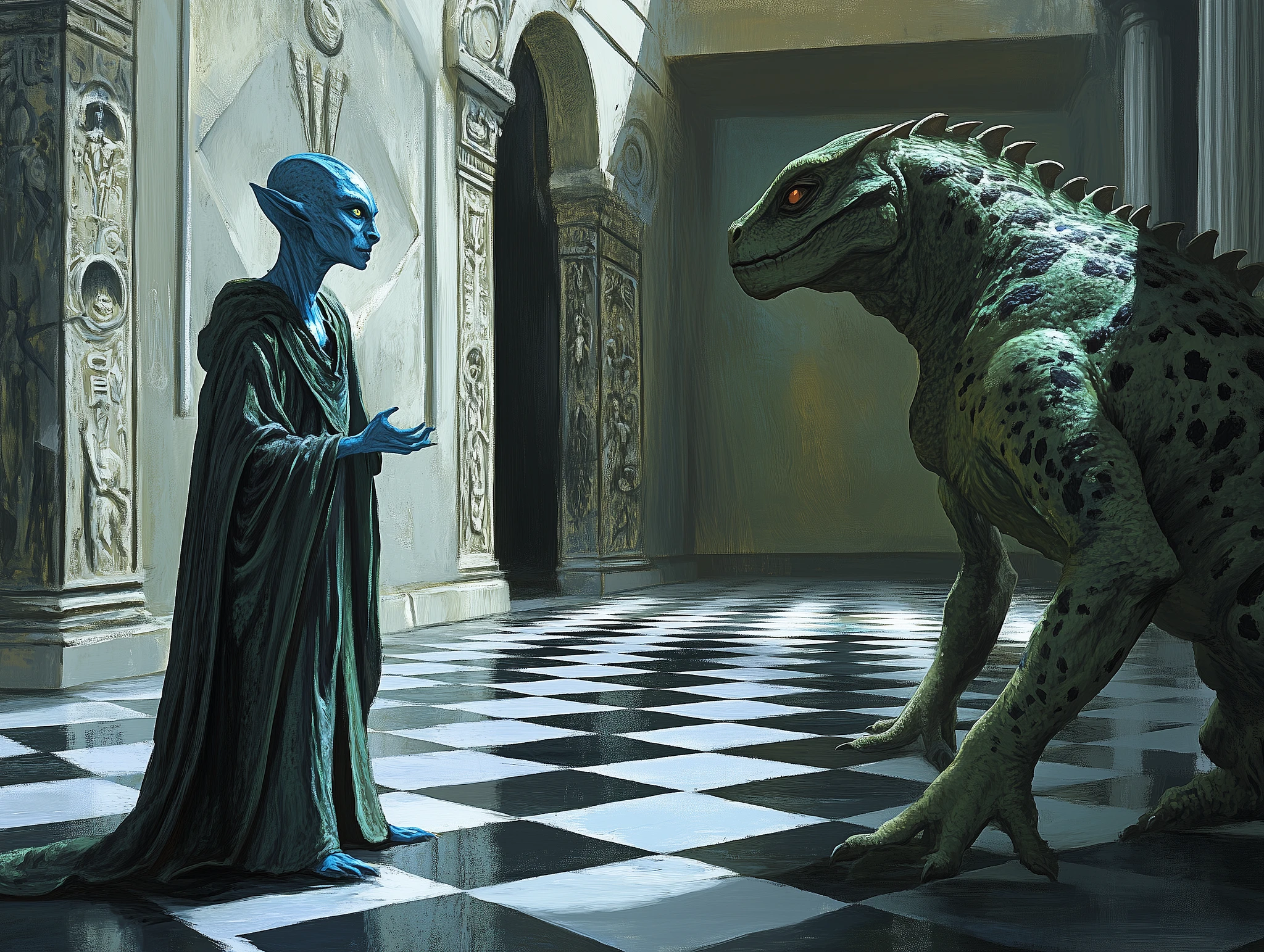 A blue alien wearing robes stands in an ancient hall with black and white checkered floors, talking to another creature that resembles Earth's lizards but has no tail or legs. The other being is much larger than the human-like figure standing before it. In the style of Surrealism. --ar 4:3 --v 6. 1