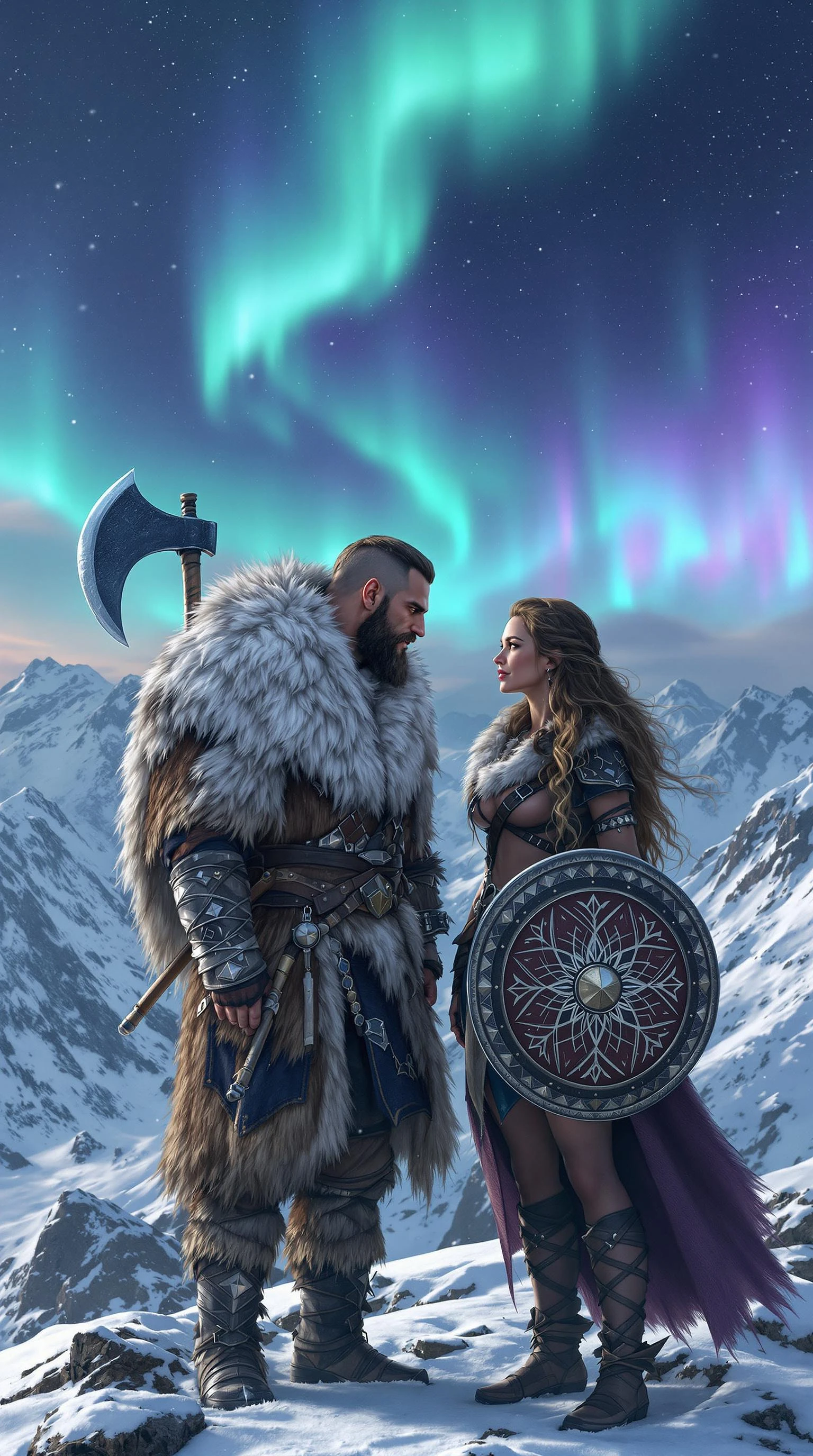 A Viking warrior and his shieldmaiden standing together on a snowy mountain peak. He has a thick fur cloak and a massive axe, while she wears a leather and fur outfit with a decorated round shield. They look into each other's eyes, the Northern Lights glowing in the sky above