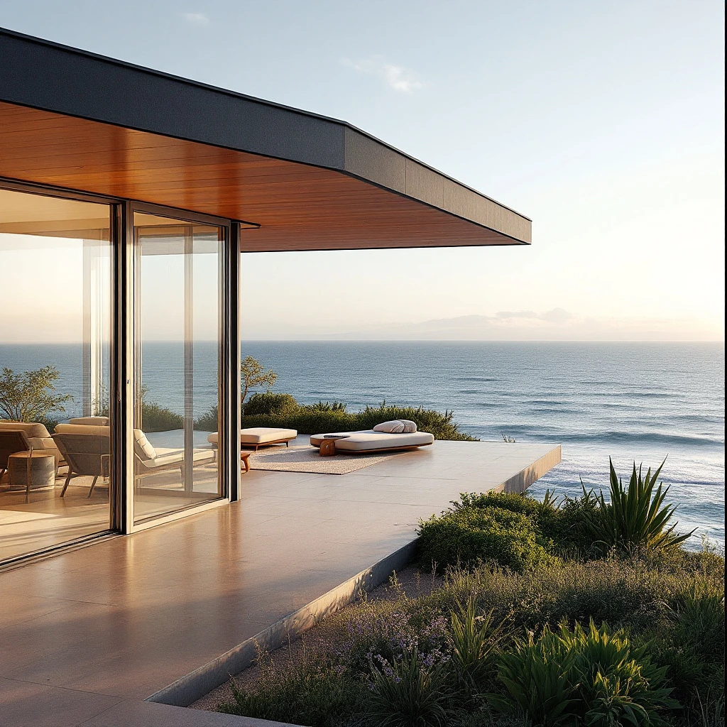 Hyper realistic eye level exterior photo of a mid century modern style house overlooking the ocean, daylight, indirect lighting, AD magazine, Frank Lloyd, Eames, Mies van der Rohe