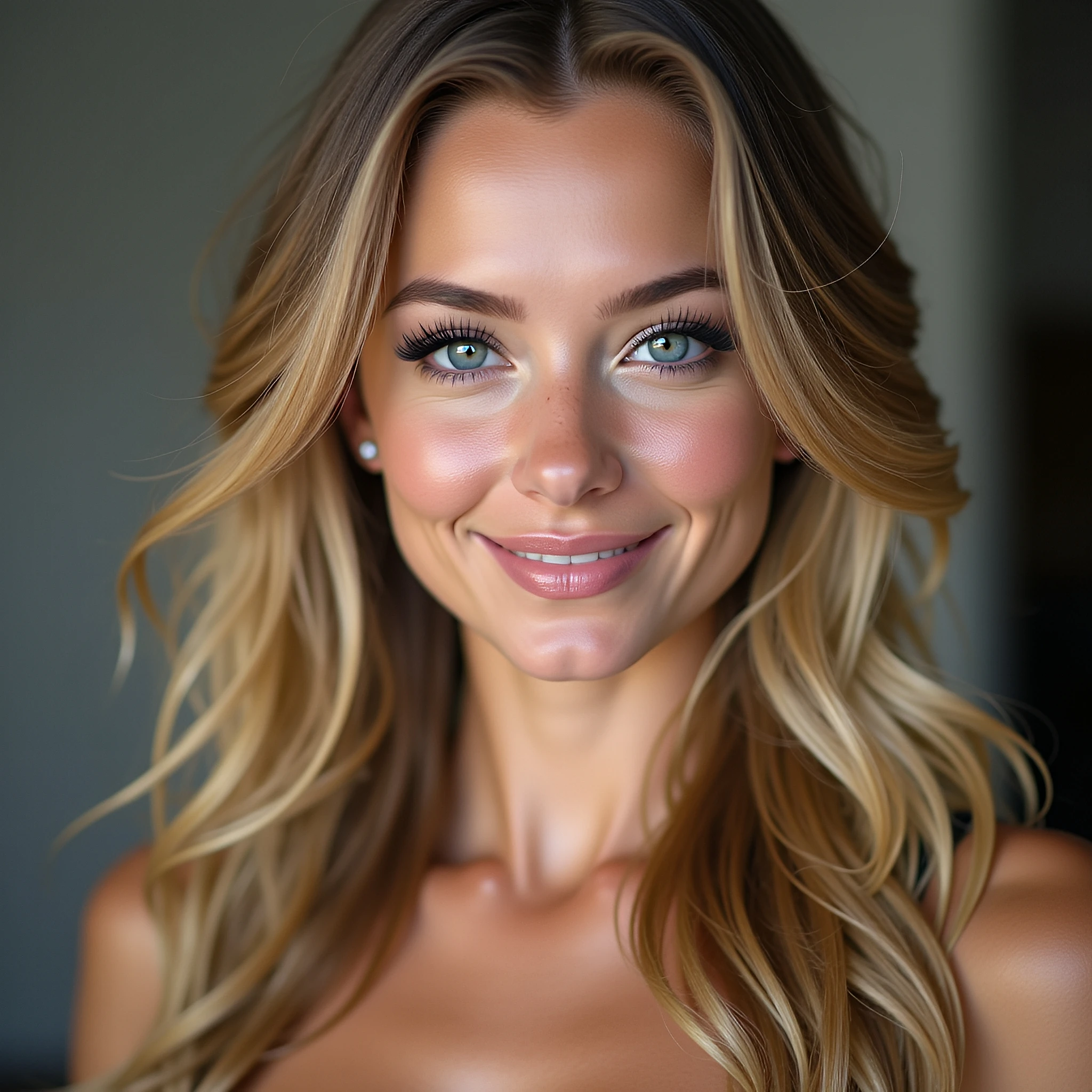 ultra-details, UHD, photorealistic, 8K RAW, professional lighting, depth of field, sharp focus, full-body shot of a ultra-details, UHD, photorealistic, 8K RAW, professional lighting, depth of field, sharp focus, full-body shot of A close-up portrait of a beautiful 24-year-old woman with extremely long wavy blond hair, Bo Derek looks like, skinny toned body, huge symmetrical chest, flirty light blue eyes, long eyelashes, glossy lips, black eye liner and a beautiful smile. Her facial features are perfectly balanced and striking.