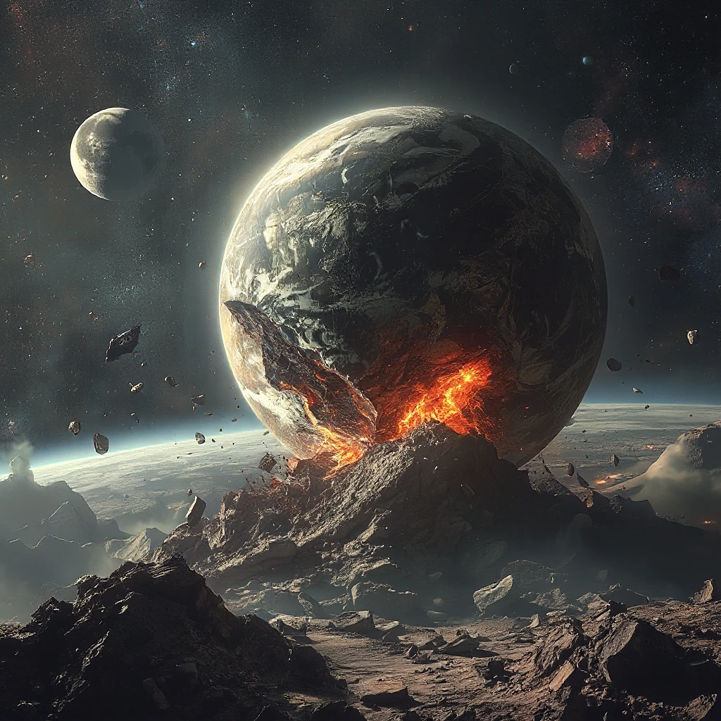 A world crashing into another, debris, space, galaxies in background, moon, crumbling planet, apocalyptic, beautiful, epic, depth of field, dramatic lighting, realstic, hyperrealistic, extremely detailed, intricate sharp details, photorealistic