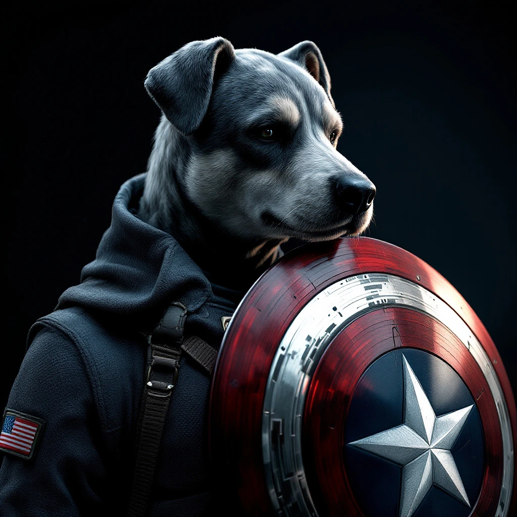 dog head anthropomorphic humanoid body, movie poster, Captain America character with shield, high detail, hyper realistic, octane rendering. --ar 4:5 --no people, girls, men, human faces