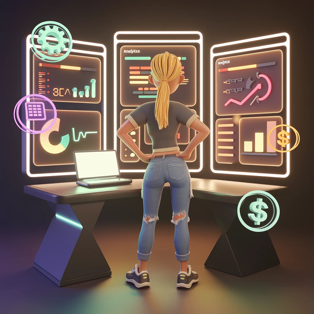 A motivational futuristic 3D scene depicting an aspiring affiliate marketer standing confidently before towering glowing screens filled with analytics visuals: upward-trending graphs bursting with color, pie charts showing revenue shares, heatmaps tracking audience engagement, and real-time traffic counters symbolizing blog success. The perspective is from behind her at a slight angle to highlight her blonde ponytail tied casually along with her relaxed outfit—a t-shirt paired with ripped jeans, apple shape rear and sneakers. A sleek desk nearby holds a glowing laptop connected to the displays. Floating icons for SEO tools (gear) , content creation (notepad) , and monetization (dollar signs) enhance the energy of the scene while neon lights in vivid hues illuminate key elements dynamically --ar 16:9 --stylize 750 --v 5.