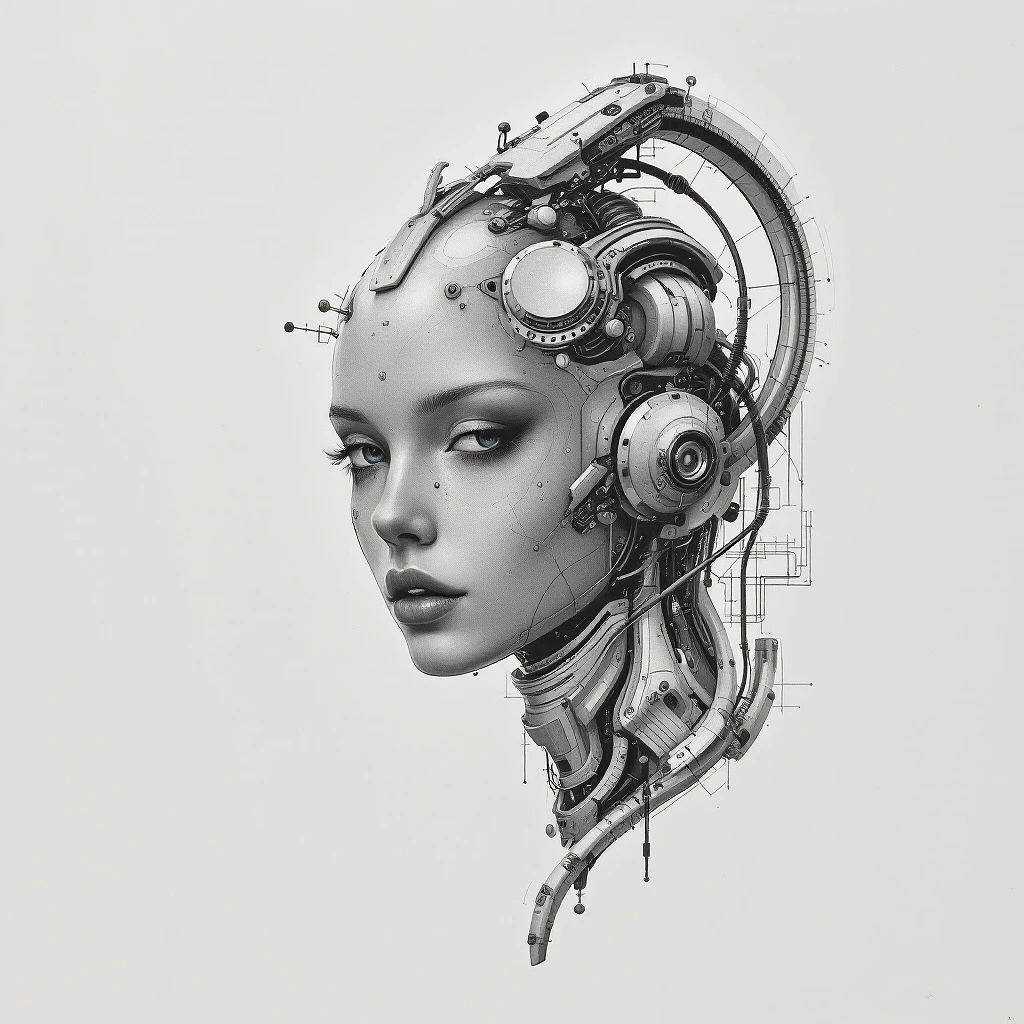This artwork shows a female cyborg, blending human features with complex mechanical elements, illustrating a seamless integration of technology and humanity. biomechanics miss universe, silverpoint drawing, cyber punk, drypoint, minimalism, --ar 16:9 --v 5. 2 --stylize 400 --style raw --v 5. 2