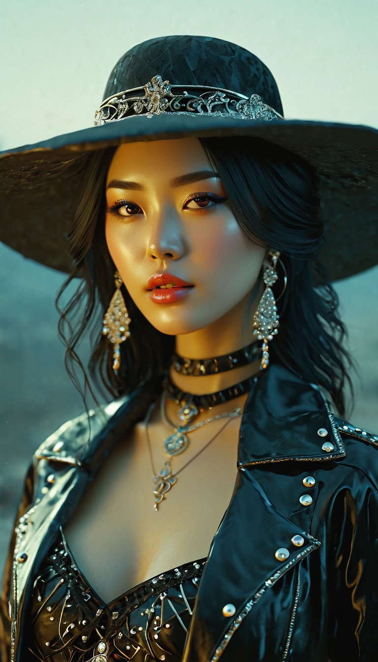 Korean girl embodying the essence of a vampire witch, adorned with a hat and distinctive skeletal elements. Draw inspiration from the unique style of Eve Ventrue, with a strong emphasis on employing V-Ray tracing techniques, mirroring the aesthetic finesse of Paul Hedley. Strive for a visual theme reminiscent of western-style portraits, seamlessly incorporating elements of cartelcore for an added edge. Ensure the image attains ultra-high definition (UHD) , accentuating both intricate details and sharp clarity. To add a distinctive touch, seamlessly integrate the concept of a 'Death Burger' into the scene, enhancing the overall uniqueness of the composition