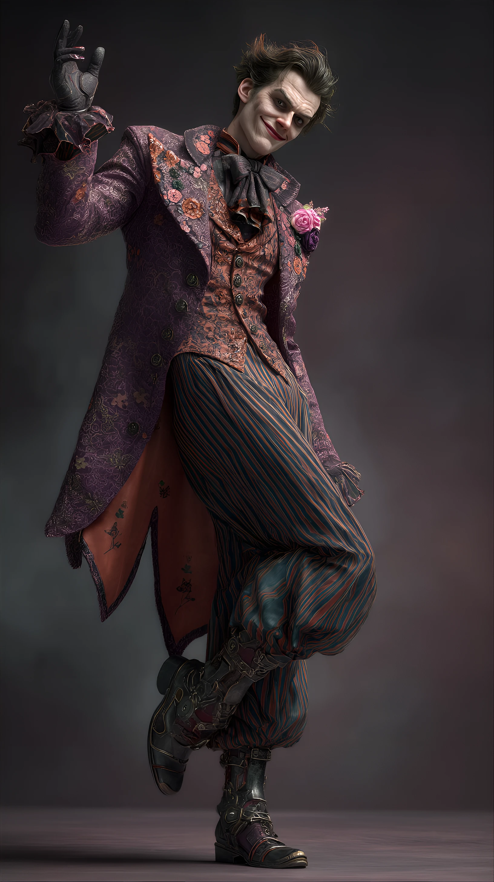 Male character, young adult, Caucasian, The Joker, pose of playful confidence, standing with one arm raised, in a vibrant, over-the-top, theatrical outfit, purple jacket with ornate floral designs, emerald green striped pants, red accents on the jacket and pants. Jacket has a formal, slightly exaggerated, tailored cut. Pants are wide-legged, high-waisted, and the striped pattern is consistent throughout, with hints of metal or mechanical parts on the lower legs. Metallic, mechanical leg piece blends with clothing, dark shoes and gloves. A small pink flower-like ornament is pinned to the jacket lapel. Expression is playful, mischievous and slightly menacing. Detailed, intricate patterns and textures, a dramatic lighting style with deep shadows, accentuating the colors. Dark purple and dark gray background