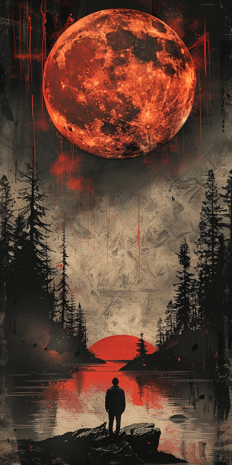 A man looing up at an enormous red moon, trees in the background, in the vintage poster style, dark colors --ar 1:2 --stylize 750