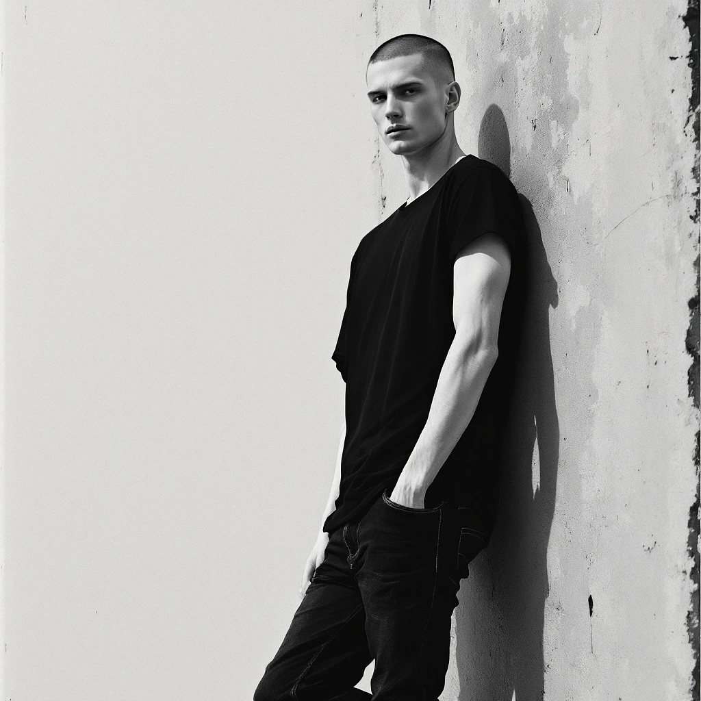 Depict a male figure from a long-range distance of about fifty feet, skinny body, black t-shirt with a closely-shaved head, and jeans, pale white skin, leaning against a wall, stands in an aloof, male model-like pose—legs slightly apart, one hand casually in his pocket, and his head turned slightly to the side with an obscured expression