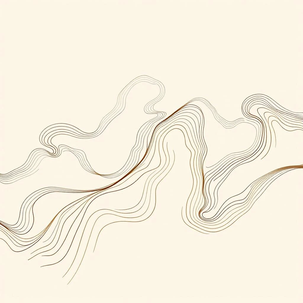 Minimalist abstract topographic line art on a soft beige background. Smooth, flowing contour lines in a warm brown tone, gently curving across the image in organic shapes. Clean and elegant layout, no labels, no shading. Modern, graphic design style suitable for wine bar branding or poster design. Sophisticated and subtle, inspired by elevation map lines but used decoratively.