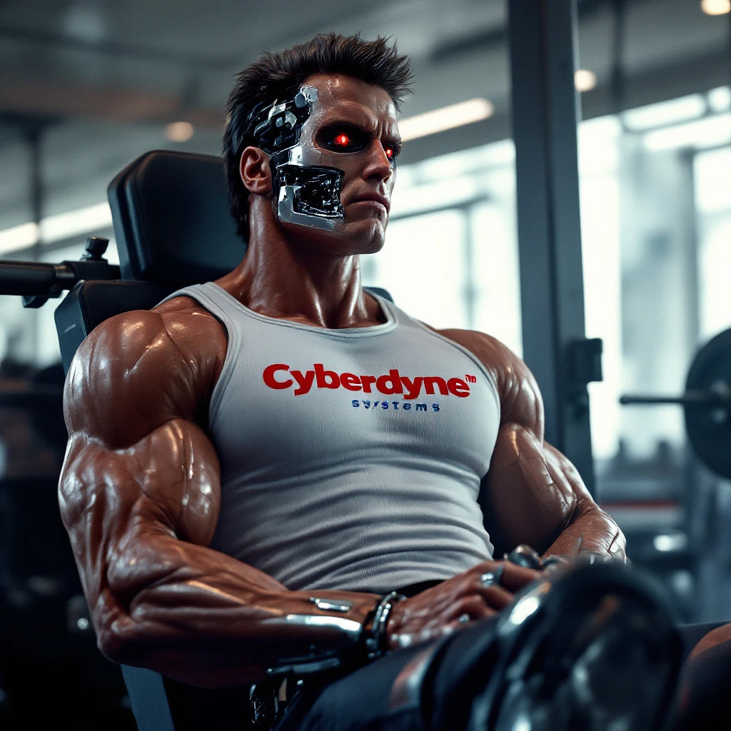 A hyperrealistic 1980s-style cinematic scene showing the Terminator from The Terminator movie seated on a bench press machine during a pause between sets in a classic 80s-style gym. He is wearing a retro, tight-fitting muscle shirt with the Cyberdyne Systems logo prominently displayed on the chest. The shirt clings to his powerful frame, with every muscle beneath the fabric well-defined and emphasized, exuding a sense of raw strength and precision. Paired with this, he wears classic 80s-style athletic shorts and high-top sneakers, completing his iconic look. The Terminator's hands rest powerfully on his thighs, palms relaxed yet strong. His hands are large, with anatomically correct features: five fingers per hand, detailed knuckles, visible veins running over the muscular surface, and a subtle metallic sheen emerging at the knuckles and joints where his advanced robotic endoskeleton is exposed beneath the skin. The transition from organic skin to advanced metal is seamless, smooth, and polished, reflecting the advanced engineering of his design. The bench press barbell is loaded with four 20 kg weight plates on each side, emphasizing his commitment to a heavy lifting session. The gym itself is a nostalgic retro 80s masterpiece, with atmospheric lighting, iconic retro gym equipment, and motivational posters scattered throughout. Visible neon signs in the background display only these phrases, contributing to the intense, motivational atmosphere: 'No Pain, No Gain, ' 'Bodybuilding & Fitness, ' and 'Push It to the Limit. ' Each phrase is displayed on glowing neon signs and posters, integrating perfectly into the atmospheric mist and lighting of the gym environment. In the background, Sarah Connor, portrayed by Linda Hamilton, is performing yoga gracefully in a classic 80s-inspired fitness outfit—high-waisted spandex leggings, a vibrant crop top, leg warmers, and a retro headband. Her movements are precise and elegant, embodying strength, discipline, and style as she stretches through a classic yoga pose. She is softly illuminated by the neon reflections, creating a seamless blend of atmosphere and aesthetics. The gym is enveloped in a misty, neon-lit ambiance. Volumetric lighting breaks through the haze, casting sharp, dramatic beams of light that illuminate the Terminator's muscular physique, his partially metallic features, and Sarah Connor's graceful yoga practice. This lighting creates an atmospheric, cinematic experience, highlighting the retro-futuristic nature of this 80s-inspired scene. Every detail is rendered in stunning hyperrealism—the texture of the muscle shirt, the glint of polished metal peeking through the skin, the alignment of weight plates, the folds of Sarah Connor's classic 80s outfit, and the soft glow of neon reflections. The scene evokes a retro action nostalgia while focusing on the Terminator's mechanical determination and Sarah Connor's strength and poise. This immersive 1980s cinematic masterpiece is a detailed vision inspired by the classic action film aesthetic.