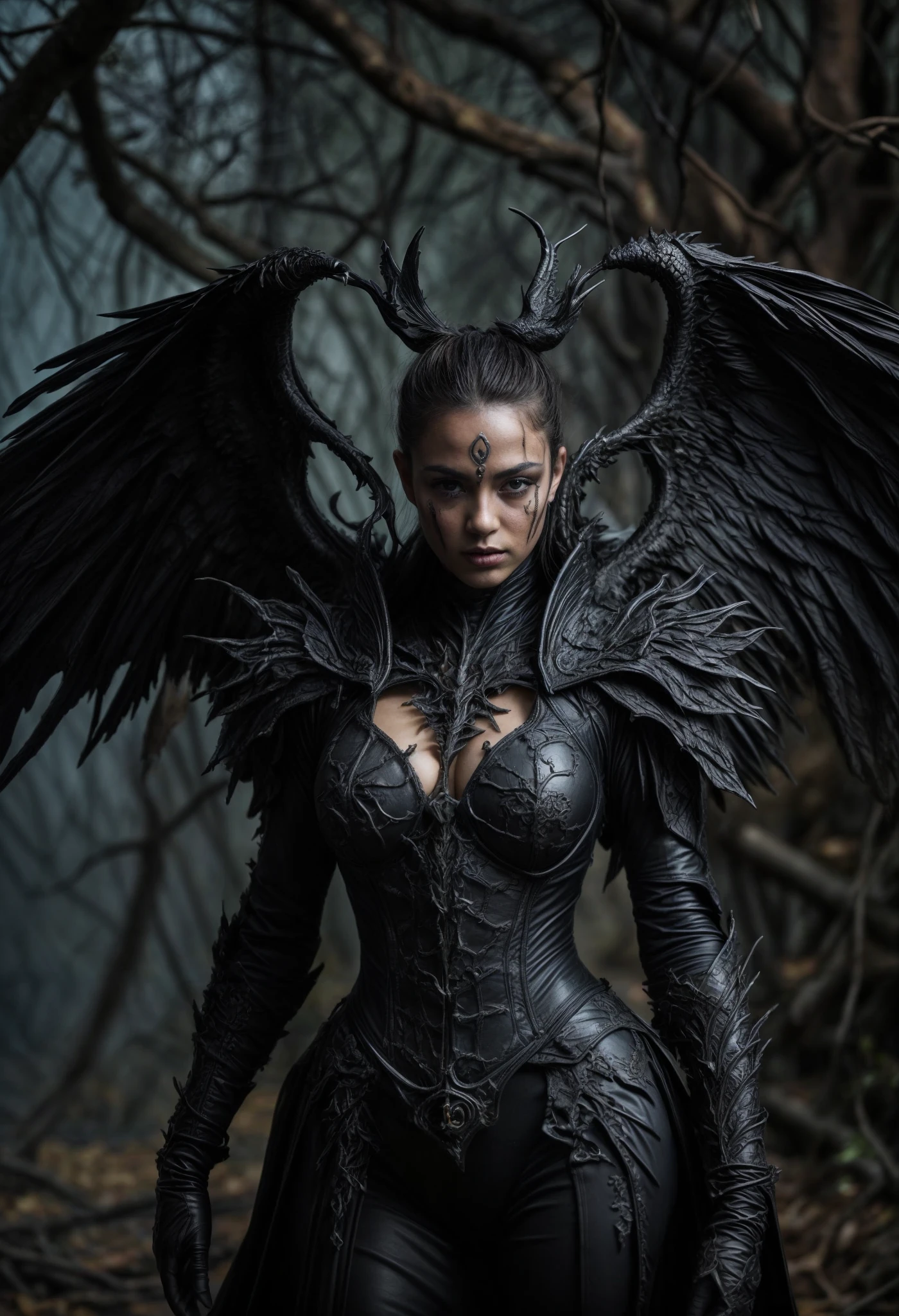 portrait, Serqet appears in her Dark Lord skin, standing in a sinister, distorted version of the underworld. The surroundings are filled with writhing shadows and twisted, gnarled trees. Serqet is clad in black armor adorned with skulls and other macabre decorations. Her wings are spread wide, and her eyes burn with an intense inner fire. Advanced lighting and shading techniques, along with high-quality textures and materials, enhance the scene.