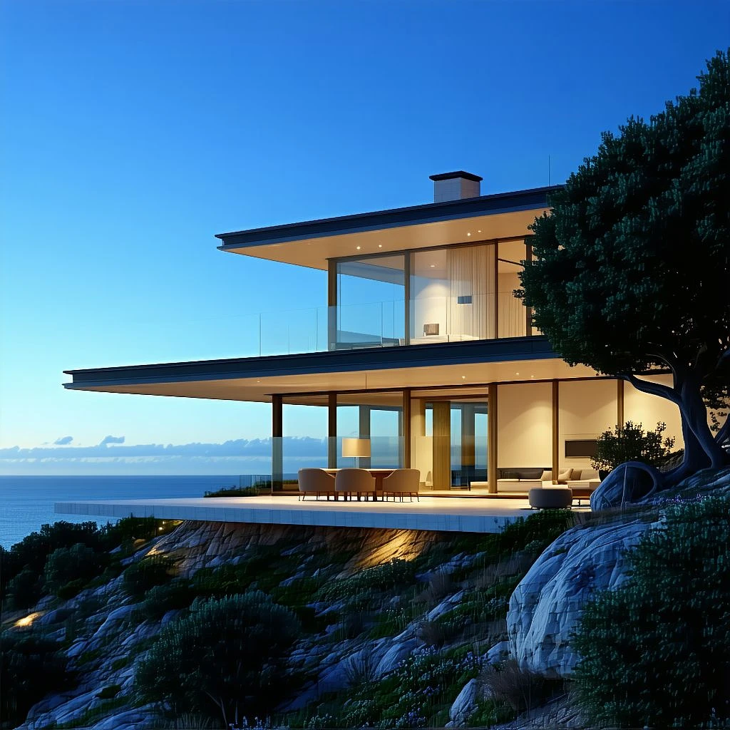 Hyper realistic eye level exterior photo of a mid century modern style house overlooking the ocean, daylight, indirect lighting, AD magazine, Frank Lloyd, Eames, Mies van der Rohe