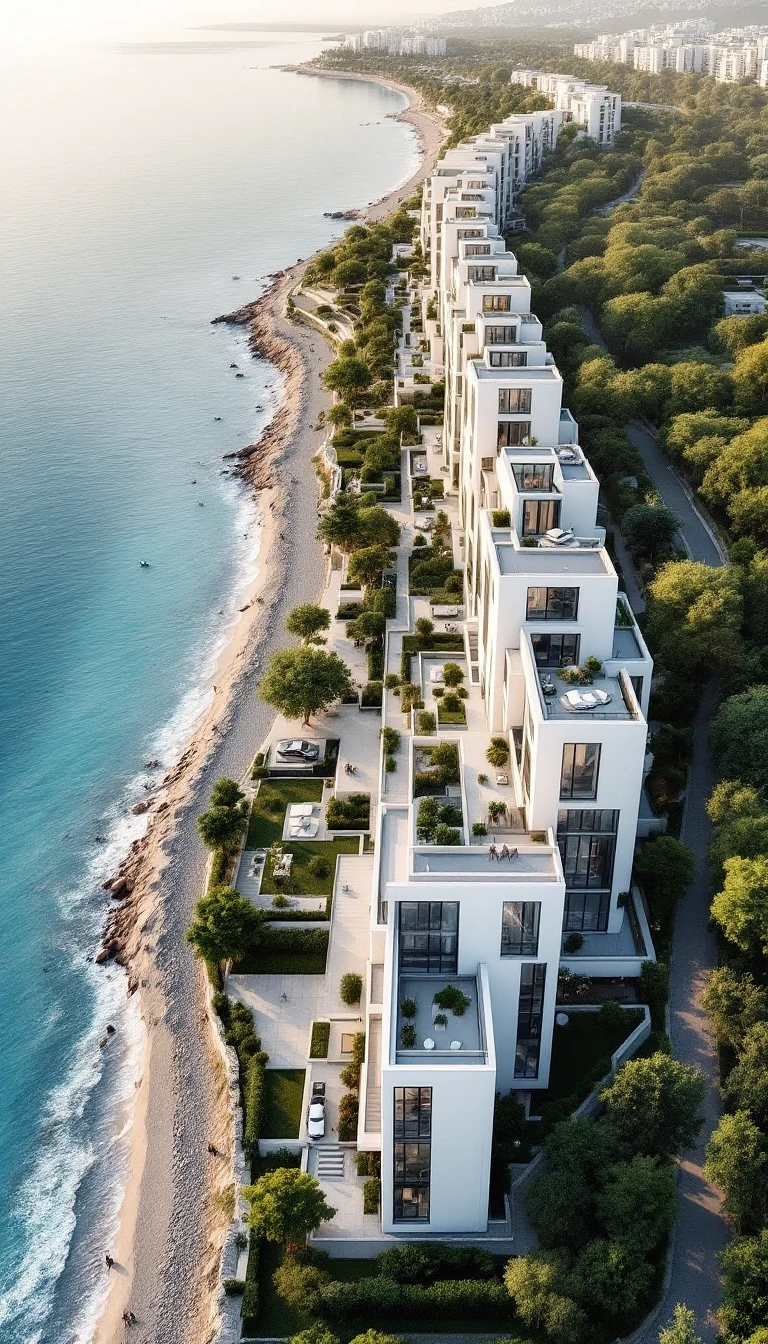 Aerial view of Crimean coastline, showcasing modern low-rise apartment complex. Elegant 3-4 story residential buildings with clean minimalist design. Pure white and light gray facades, extensive glass surfaces, flat geometric roofs. Multiple parallel buildings positioned along pristine seafront, creating harmonious architectural ensemble. Scandinavian-inspired minimalism with precise architectural lines. Each building has slightly different configuration but maintaining unified design language. Wide terraces, large panoramic windows facing sea. Soft natural lighting, golden hour atmosphere. Meticulously landscaped area between buildings with modern minimalist green zones. Neutral color palette - whites, light grays, soft concrete tones. High-end residential development, 8K resolution, hyper-realistic architectural rendering. Empty of people, focusing on architectural elegance and spatial harmony. Subtle reflections, clean edges, perfect symmetry