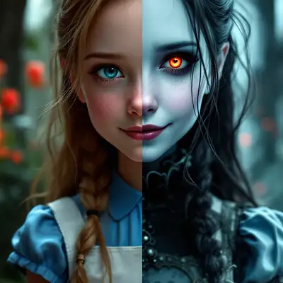 Focus on Alice Liddell from Alice: Madness Returns, smiling slightly with glowing red eyes that shine in the dark, capturing her eerie and unsettling expression. Her pale skin contrasts with her dark brown hair and tattered blue Victorian-style dress. The atmosphere around her is dark and haunting, but the emphasis is on her eyes and smile, which exude a supernatural, eerie vibe. Semi-animated art style with exaggerated features, vibrant colors, and intricate details.