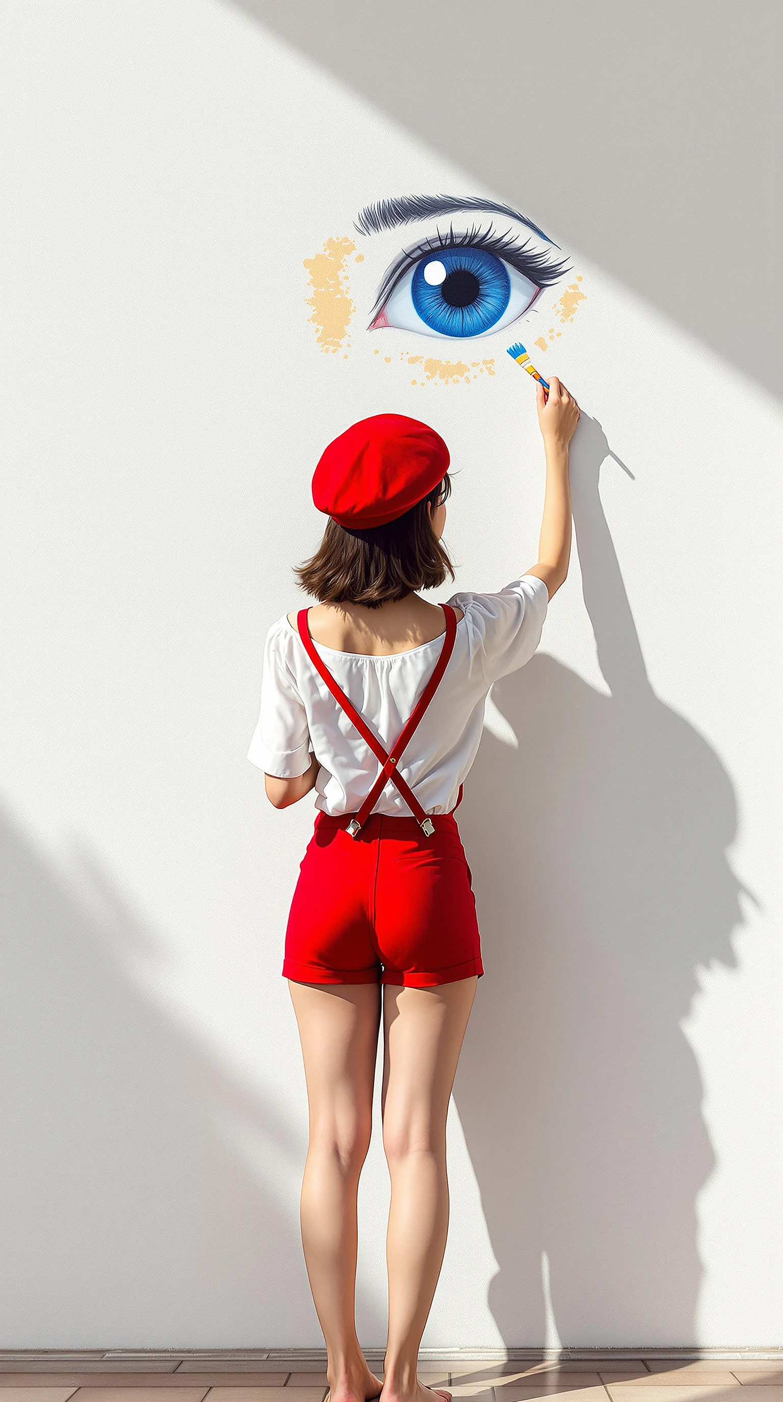 Full body view of a Woman (Ethnicity: 1.0) , (Age: 20) , (Clothing Details: 1.2) , (Accessories: 1.2) , (Facial Features: 1.3) , (Expression: 1.2) , (Body Type: 1.2) , (Pose: 1.2) wearing a red beret, a white blouse and red shorts with suspenders, painting a white wall with a brush drawing a big blue eye, detailed hair and eyebrows, fair and bright skin stained with yellow and blue color spots, delicate makeup with red lips, slim body, bare feet, beautiful feet only 5 toes on each foot, show foot, natural light, comic style, digital painting, photorealistic skin texture, 3/4 view, (Detailed Clothing Folds: 1.1) , bright colors and soft lighting, strong shadows, thin wall texture, elegant, comic art, upper body slightly leaning towards the wall, slightly posing; Artistic style, highly detailed illustration, hyper-realistic style, detailed shading, realistic background.