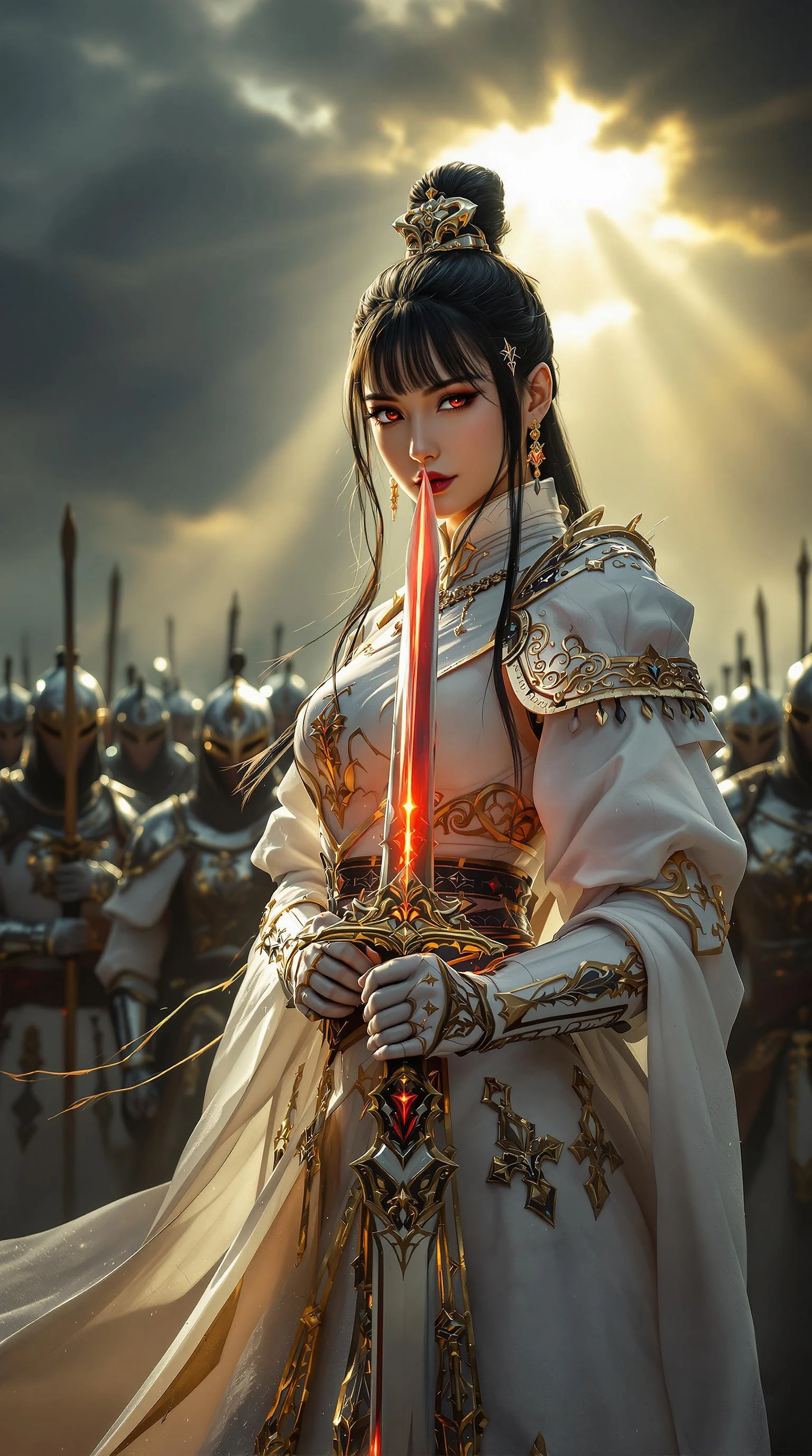 Female oriental knight in full armour, white with gold embellishments, bangs, earrings, holding a legendary sword by the hilt, the sword glowing red, in front of a group of medieval warriors, illuminated by rays of sunlight between dark clouds Behind her you can see a group of medieval warriors, High Detail, Perfect Composition, dark fantasy movie