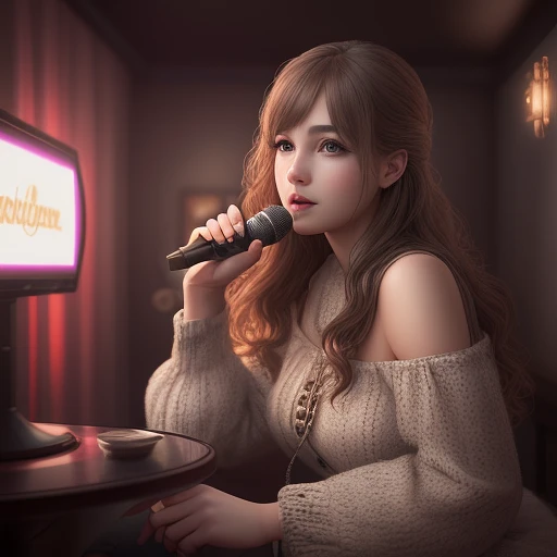 beautiful girl with karaoke, interior design magazine, cozy atmosphere; 8k, intricate detail, photorealistic, realistic light, wide angle