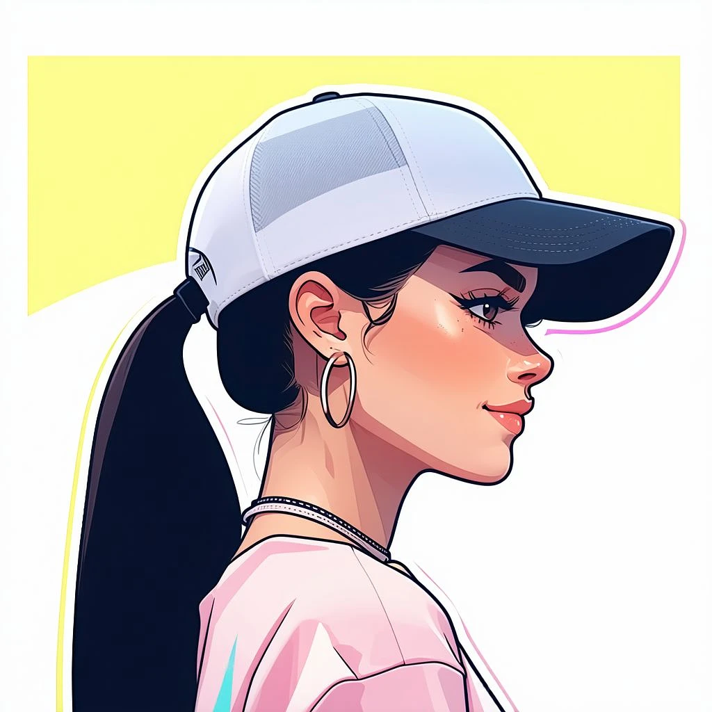 A profile picture of an animated cartoon headshot portrait of a woman with a black ponytail, wearing a backwards baseball cap, pastel-colored background in a sticker-style illustration. --chaos 75 --ar 1:2 --stylize 750