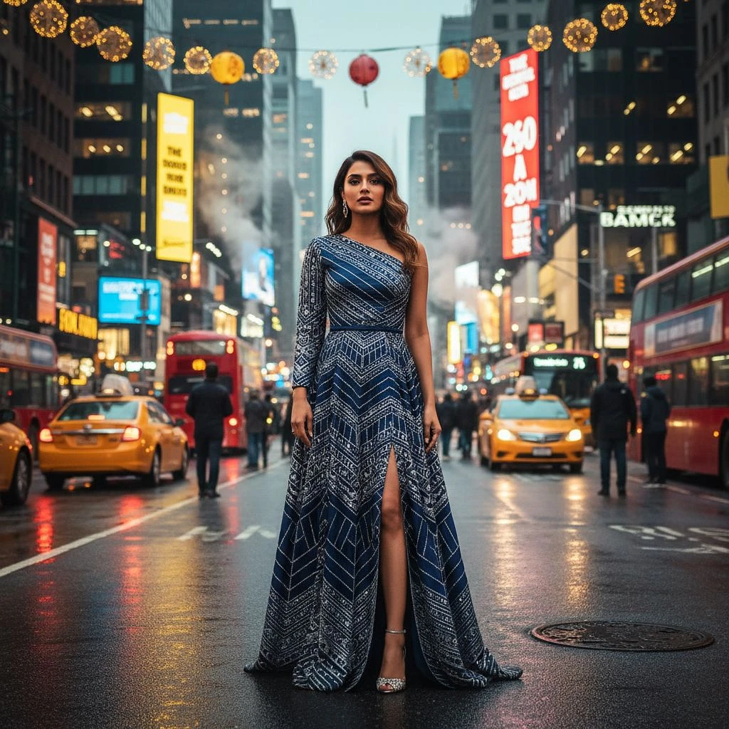 Full-body cinematic portrait of the same South Asian woman, wearing a modern elegant dress, standing in a bustling city street, glowing evening lights, ultra-realistic.