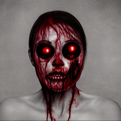horror image, realistic, demon zombie woman, jump scary, portrait , no eyes, torn face, shining white eyes with red vessel, full face, 8k, real, hyperdetailed, frightful, torn face, shining creepy eyes
