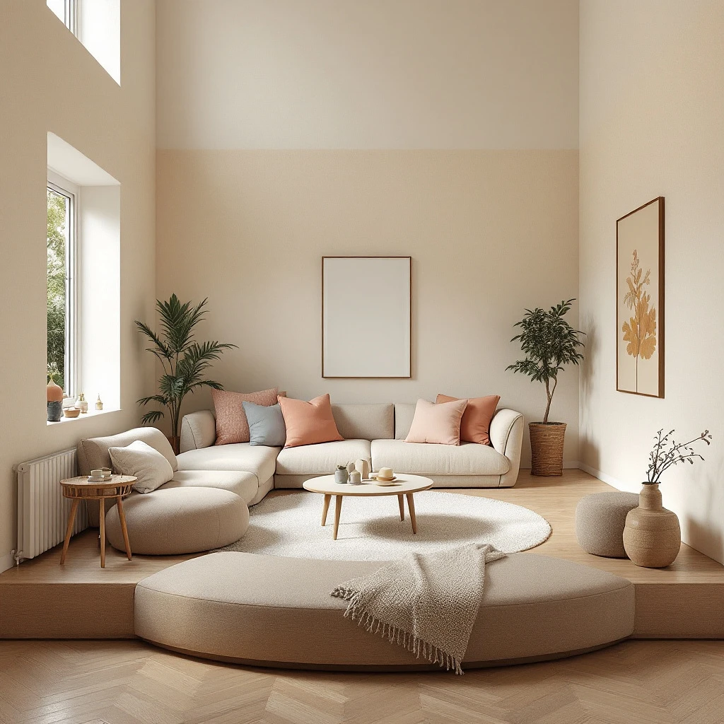 High resolution photography interior design, dreamy sunken living room conversation pit, wooden floor, small windows opening onto the garden, bauhaus furniture and decoration, high ceiling, beige blue salmon pastel palette, interior design magazine, cozy atmosphere; 8k, intricate detail, photorealistic, realistic light, wide angle, kinkfolk photography, A+D architecture