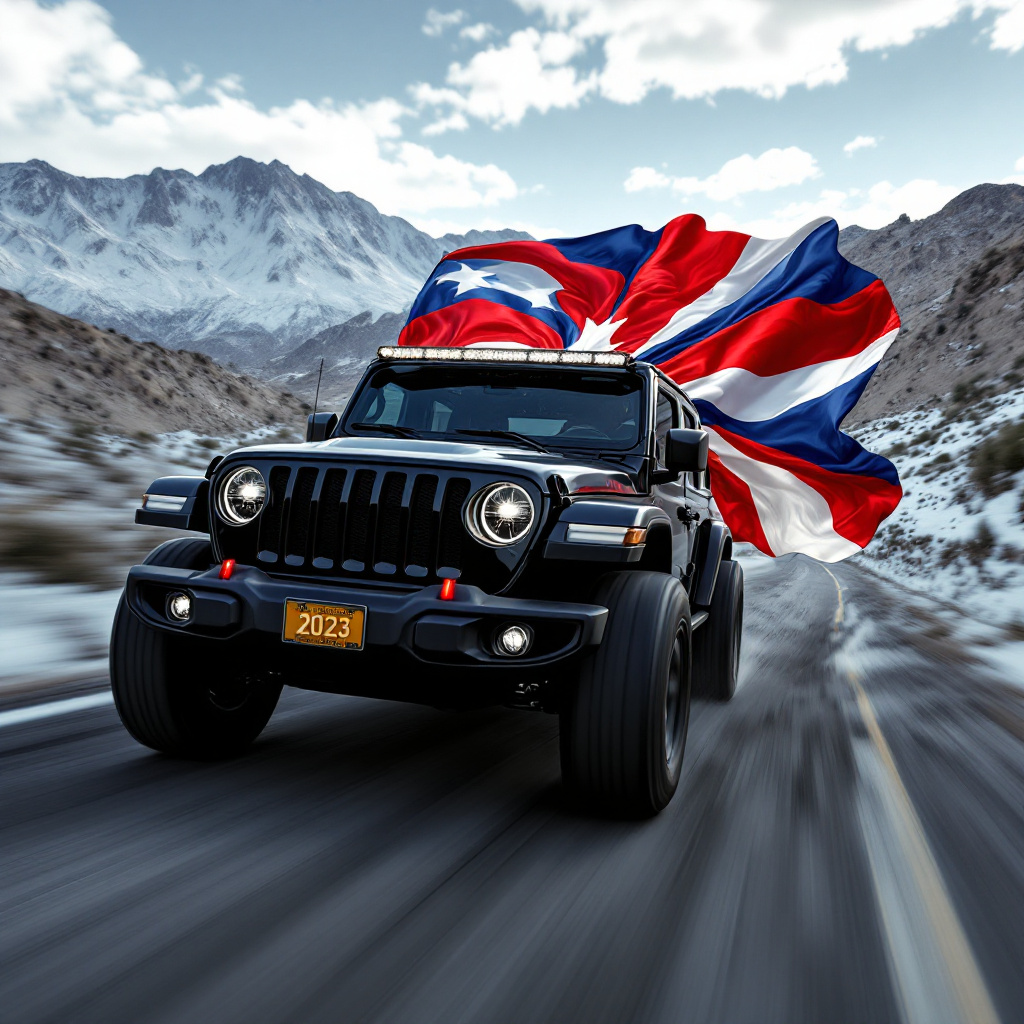 FLUX prompt: Hyper realistic photo of a speeding 2023 Jeep Moja...
