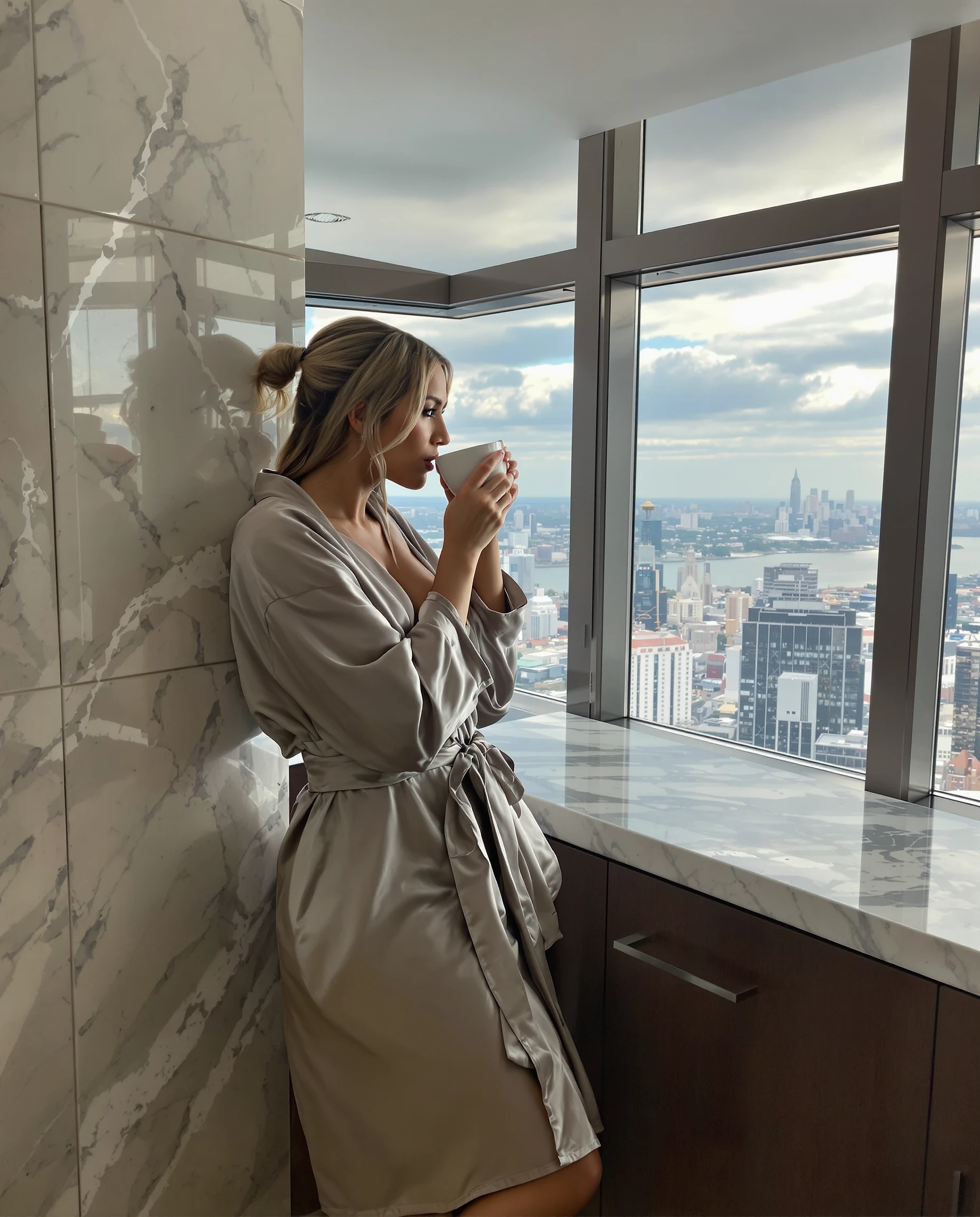 lucy pinder leaning against a marble countertop in a luxury penthouse, wearing a silky robe that drapes off her shoulder. She sips from a coffee cup, gazing out at the city skyline through floor-to-ceiling windows.