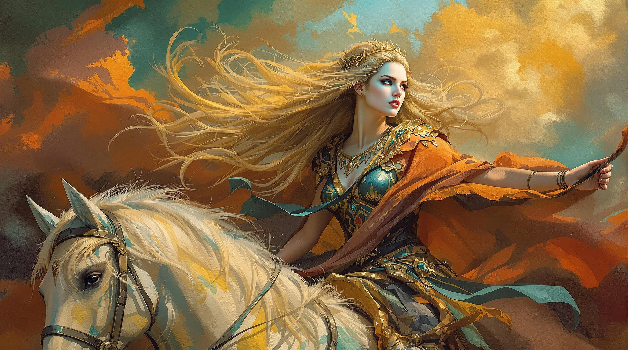 A grand epic scene in a classic oil painting style, hyper realistic depicting the ride of the valkyries, warior woman Her skin is pale, her features sharp, and her iridescent clothing contrasts with warm terracotta and cool teal tones. The lighting is dramatic, with visible brushstrokes and a rich texture. Heroic elements and a massive scale are emphasized.