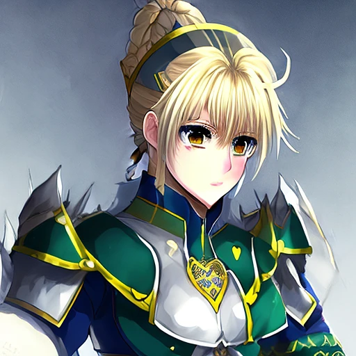 Saber, "Artoria Pendragon", "Arturia Pendragon", "Hiromitsu Takeda art style", "Takeda Hiromitsu art style", "heart-shaped face", manyuu, chounyuu, bakunyuu, , blonde hair, green eyes, braided hair bun on back of head, armored boots, faulds, gauntlets, blue dress, armored chestplate, armored dress, grey boots, metal boots, long locks, form-fitting armor