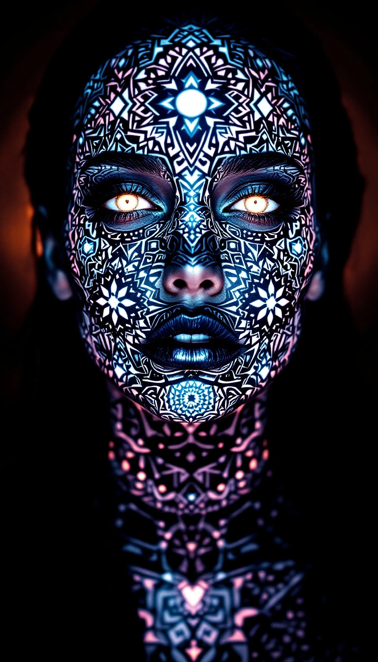 An enigmatic, waist-up portrayal of a woman, her face and neck covered in intricate, geometric tattoos that seem to shift and pulse with an inner light, each pattern telling a hidden story and revealing a secret knowledge. The style merges the detailed symbolism of tribal art with the bold aesthetics of contemporary tattoo culture and the abstract beauty of geometric art.