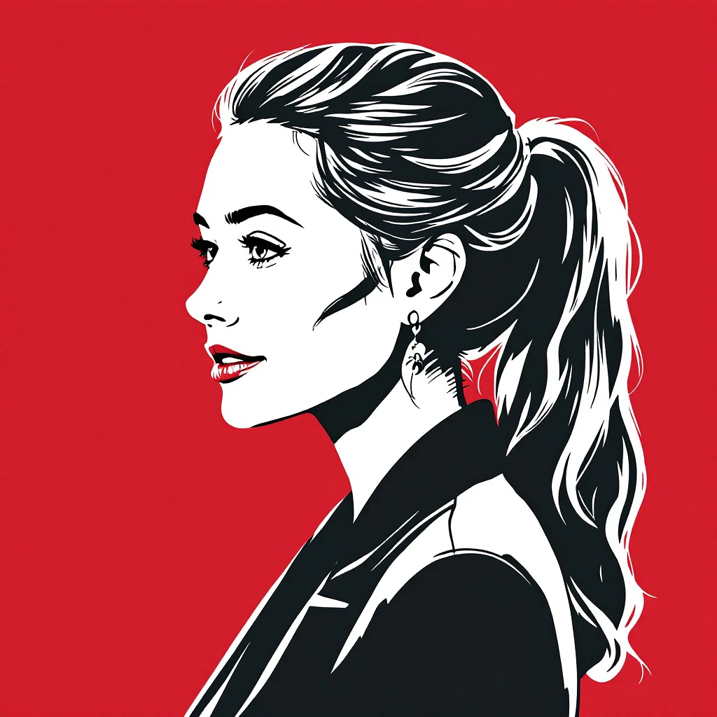 illustration, side profile of a middle-aged woman, white silhouette on deep red background, long wavy hair in a ponytail, strong cheekbones, wearing a blazer, subtle laugh lines around eyes and mouth, elegant and sophisticated style --ar 9:16 --quality 2 --style raw --sref 428240170 --v 6. 1 illustration, side profile of a middle-aged woman, white silhouette on deep red background, long wavy hair in a ponytail, strong cheekbones, wearing a blazer, subtle laugh lines around eyes and mouth, elegant and sophisticated style --ar 9:16 --quality 2 --style raw --sref 428240170 --v 6. 1