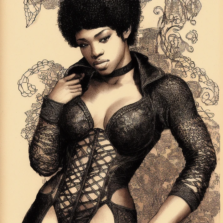 portrait of a African American woman, dressed in leather lingerie, pen and ink, intricate line drawings, by craig mullins, ruan jia, kentaro miura, greg rutkowski, loundraw