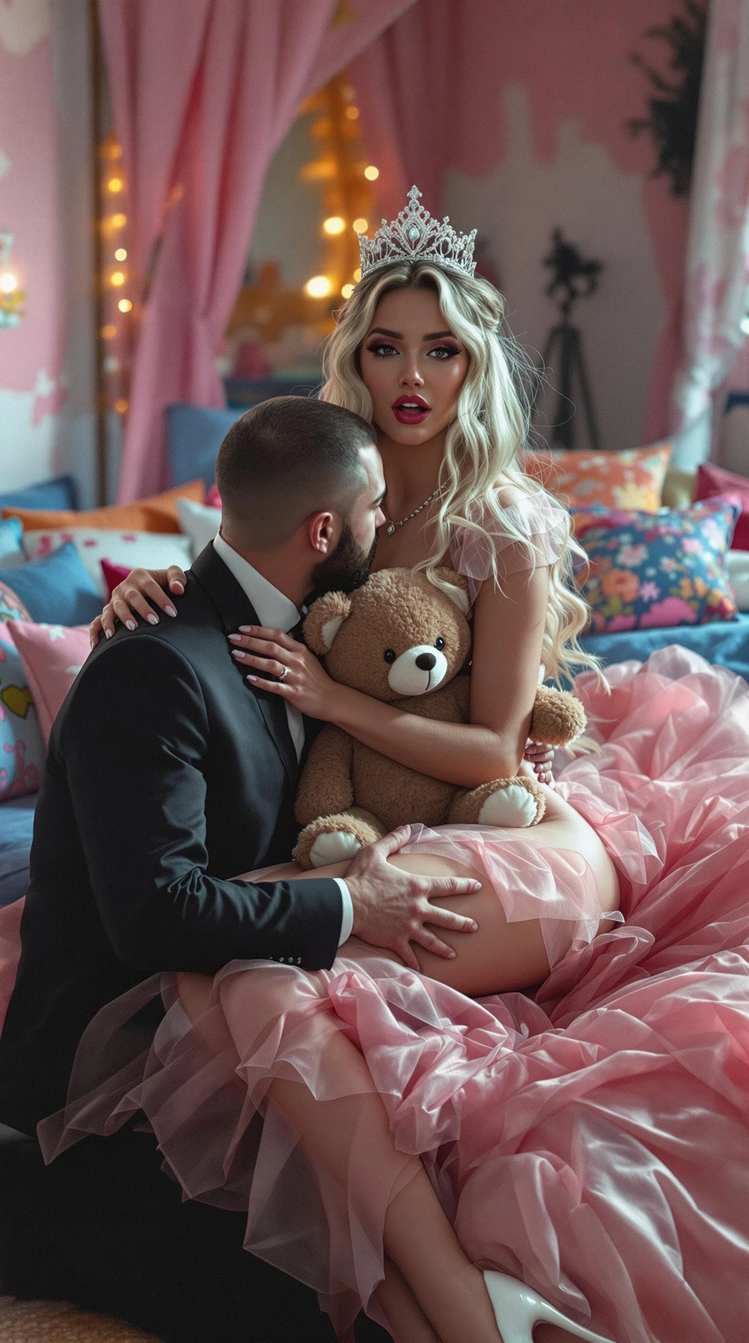 zPDXL3, score_9, score_8_up, score_8. score_9, score_8_up, score_9_up, high quality, realistic, raw lighting, detailed, (warm colors, bokeh, Natural skin) On a porn movie set you can see cameras, light stands, monitors, and there is a big blue and pink bed with lots of colorfull pillows. the walls are decorated like a collegiate girl's room. A blond woman with long hair dressed like a fairy tale princess with a pink tulle dress and missy tiara, white louboutin shoes with stiletto heels she spread her legs and shows her pussy under her tiny panties, and hugging a teddy bear. The facial expression is sensual and provocative, the mouth is open. an adult man in an elegant suit with a neat beard and very short hair is kneeling on the bed with his dick out of his pants