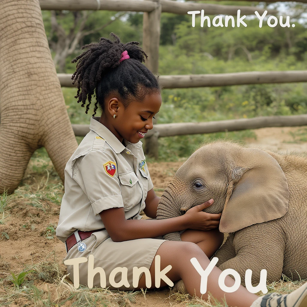 full-body view: A young African American girl with locs in a ponytail wearing a safari outfit is sitting down, petting a baby elephant in a safari setting with the text 'Thank You'