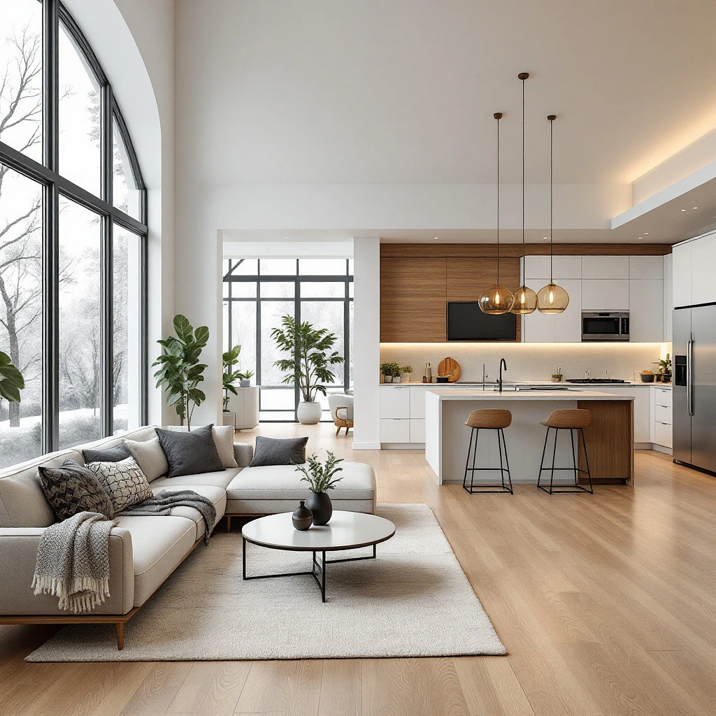 A modern and stylish open-concept living room and kitchen with a warm, inviting atmosphere. The living room has a cozy L-shaped sofa with decorative pillows, a sleek coffee table, and a large flat-screen TV mounted on a wooden accent wall. A soft rug lies under the seating area, and floor-to-ceiling windows let in plenty of natural light. The open kitchen features a spacious island with barstools, pendant lighting, and stainless steel appliances. White and wood cabinetry complement the minimalist yet elegant design. The flooring is light hardwood, and indoor plants add a fresh touch. The color scheme includes neutral tones with soft warm accents, creating a harmonious and luxurious ambiance.