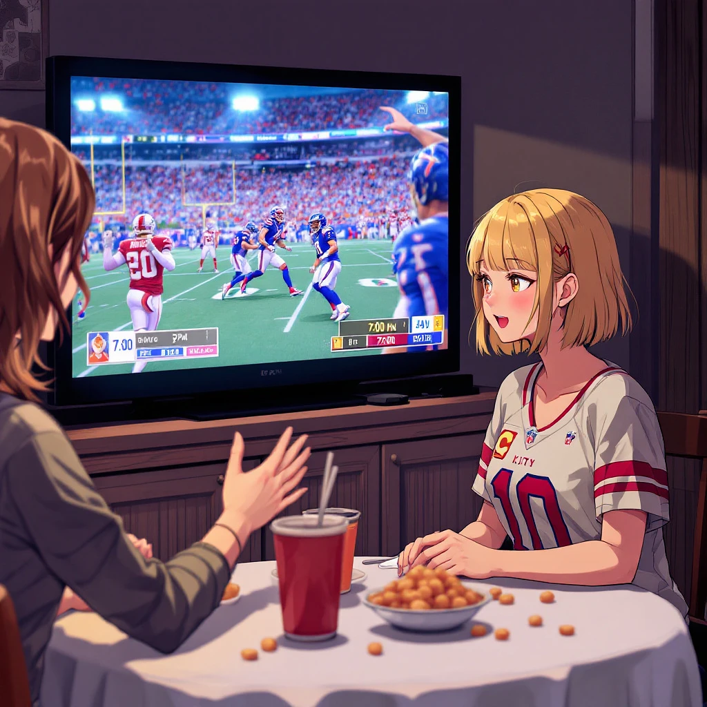 1girl, medium one-length haircut, best blonde hair, party, snacks on table, 7:00 pm, home party, nfl game on tv, wearing kansas city uniform, sitting next to tv, cheering, house, indoors, another girl, has long wavy brown hair, wearing buffalo bills uniform. anime, anime faces, happy, created by Artgerm, volumetric lighting, photography, holga, 300mm lens f3. 5, aesthetic, unsharpened, no blush