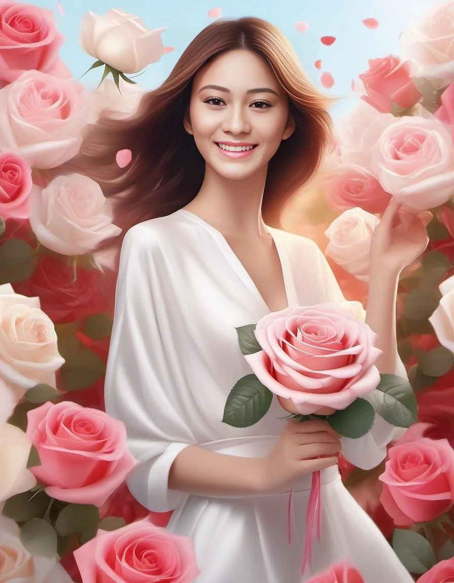 a row of beautiful bouquet of redish, pink and white roses in the hands of smiling blonde woman, woman looking forward, woman dancing full-length, sunny bright day, beautiful, realistic, 3d, illustration, white background with rose petals