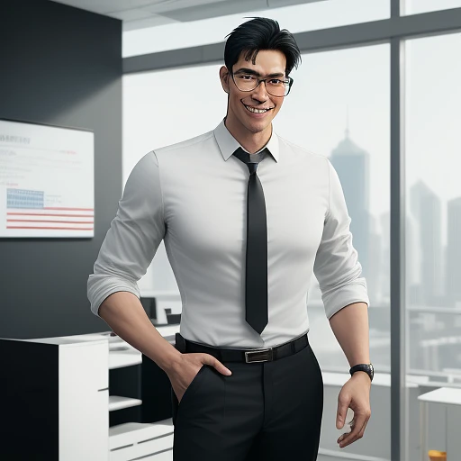 tall and strong , handsome guy, with masculine face feature, with cool glasses,east asian man,with glasses, slice smile,full body, business man looking, white shirt, in stylish modern office, with american flag, octane render, trending on artstation,tsymmetrical artwork. cinematic, photorealism, high detail, octane render, 8k, -- avoid blur