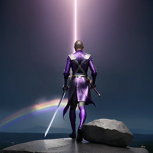 purple coated man walks to rock and puts his sword into it. the rock starts sparkling and shining in rainbow colors. View is from behind the man