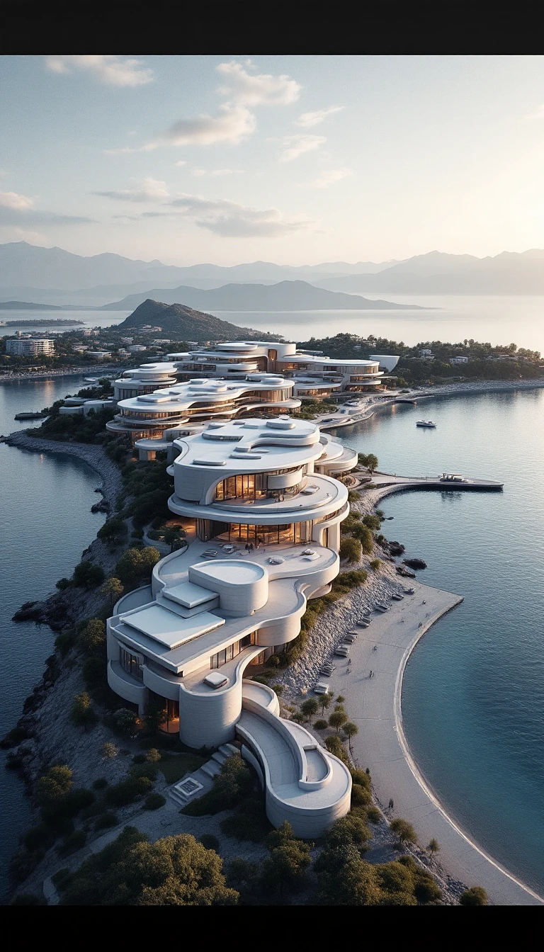 Ultra-realistic aerial cinematic view of Crimean coastline, focusing on modern luxury hotel complex. Minimalist architectural design with clean, geometric lines and flat white/gray roofs. Sleek contemporary buildings with glass facades, seamlessly integrated into coastal landscape. Pristine waterfront with architectural precision, minimal landscape intervention. Scandinavian and Japanese minimalist design influence. Sharp architectural lines, maximum transparency, neutral color palette - whites, grays, soft concrete tones. Modern infrastructure, subtle architectural bridges connecting buildings. Golden hour lighting with soft shadows, creating depth and sophistication. Hyper-detailed urban planning, 8K resolution, photorealistic architectural photography style. Emphasis on clean design, negative space, and architectural elegance. No traditional mountains, focus on smooth coastal terrain and cutting-edge architectural solutions.