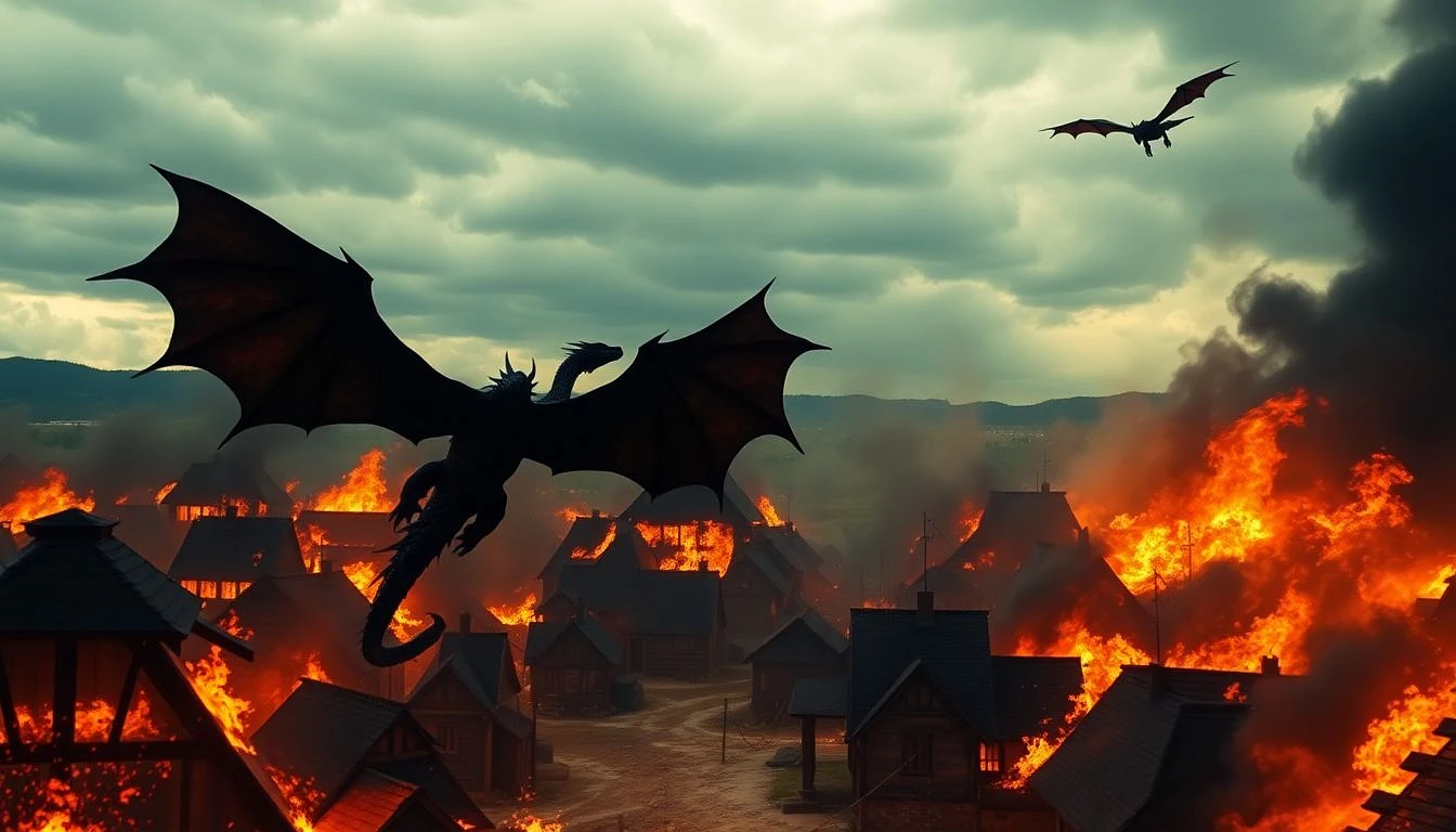 The image depicts a dramatic and intense scene of a village in flames, with a large black dragon flying in the foreground and a second dragon flying in the distance. The village is engulfed in a massive fire, with flames and smoke billowing into the air. The first dragon, with its wings spread wide, appears to be flying away from the village, possibly having just attacked it. The second dragon, also black, is flying in the distance, adding to the sense of chaos and destruction. The dark and cloudy sky above adds to the ominous atmosphere, suggesting a sense of danger and uncertainty.