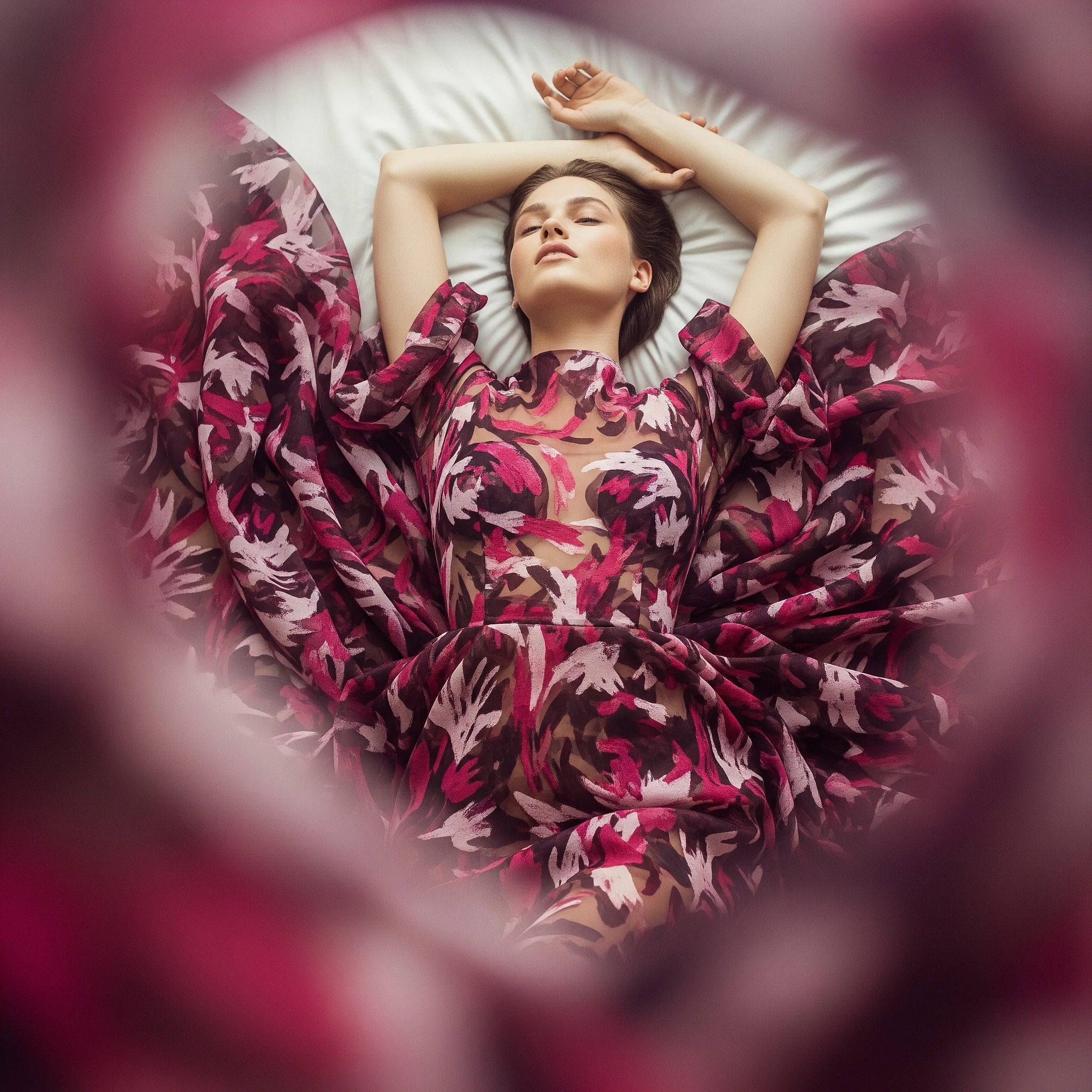 A dreamy, fashion-forward photograph of a model in a sheer, intricately detailed gown. The dress is covered in an abstract, painterly pattern of deep crimson and dark maroon, creating a striking contrast against her skin. She is lying on a bed, with her arms above her head, embodying a sense of carefree elegance. The image has a soft-focus, ethereal quality, emphasizing the delicate nature of the fabric and the relaxed, natural pose. Use a shallow depth of field to highlight the subject and the flowing fabric of the dress.