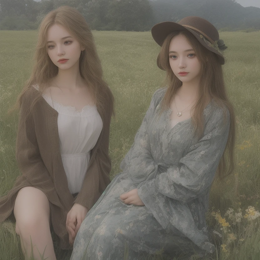 Here is the revised description: Two women are sitting together in a cozy pose, looking comfortable and at ease, in a serene field filled with green grass and wildflowers. One woman has long blonde hair, while the other has long brown hair. They are both wearing casual black outfits. The image is captured from a wide-angle perspective, showcasing the vastness of the field and the women's connection with nature. The lighting is soft and gentle, and the camera has captured a warm and inviting moment between the two women.