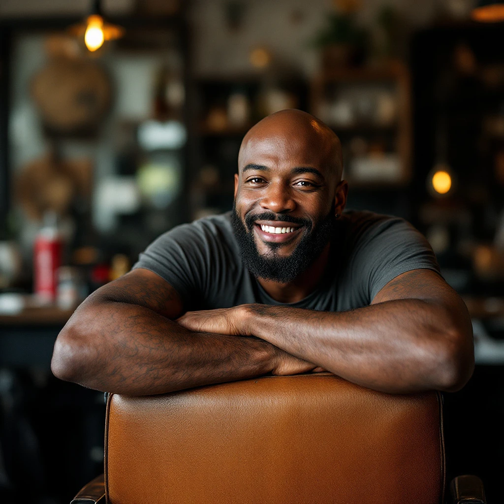 a black man with bald head leans on a chair in barbershop in the style of social media portraiture, earthcore, coastal scenes, smilecore, fujifilm eterna 500t, lively tavern scenes, rusticcore --ar 63:64 --stylize 750