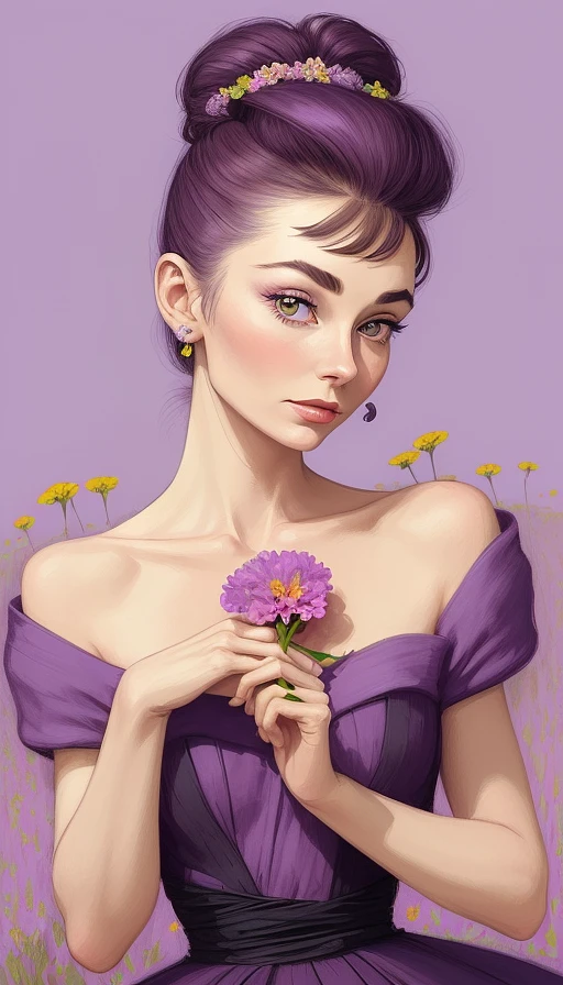 A picture of a beautiful woman holding a vibrant flower, inspired by Audrey Hepburn, piercing eyes details, delicate hands, and elegant appearance, dancing on a meadow, Multibrot style, vibrant and colorful focus portrait, pink and purple colors, drawn by Tracie Grimwood --ar 9:16 --q 2 --niji 5