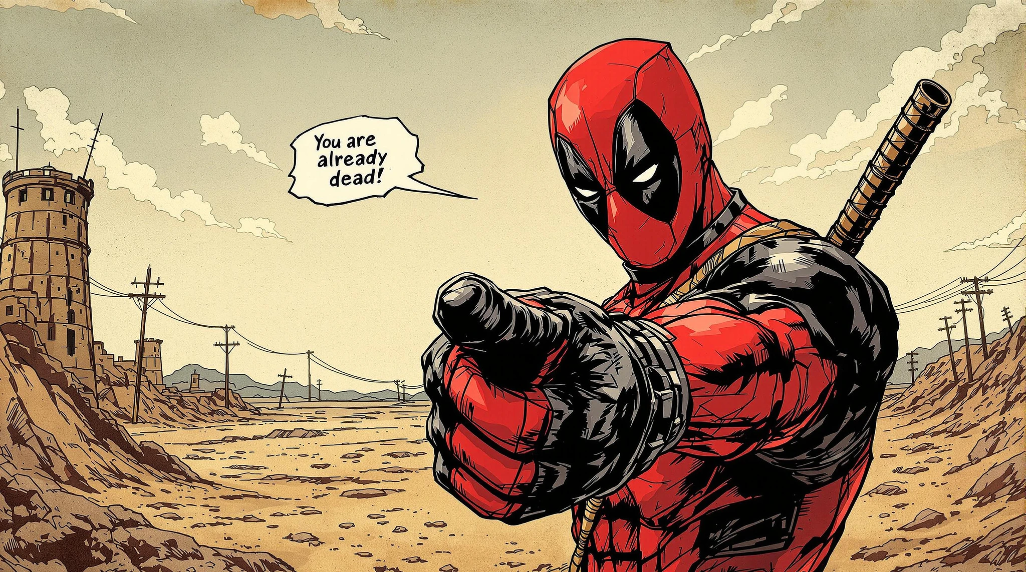 High tension, Grunge, Color Comic style illustration of Deadpool, a powerful character from 'Fist of the North Star', pointing his index finger to the viewer and seriously saying in a speech bubble, 'You are already dead! ', with a wasteland background. , illustration, ukiyo-e
