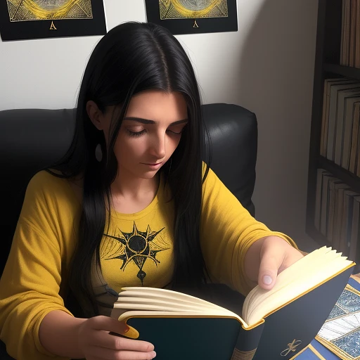 una foto realista, de una chica de 20 años, cabello negro, usando un hottie amarillo, leyendo las cartas del tarot, un atmosfera esoterica.