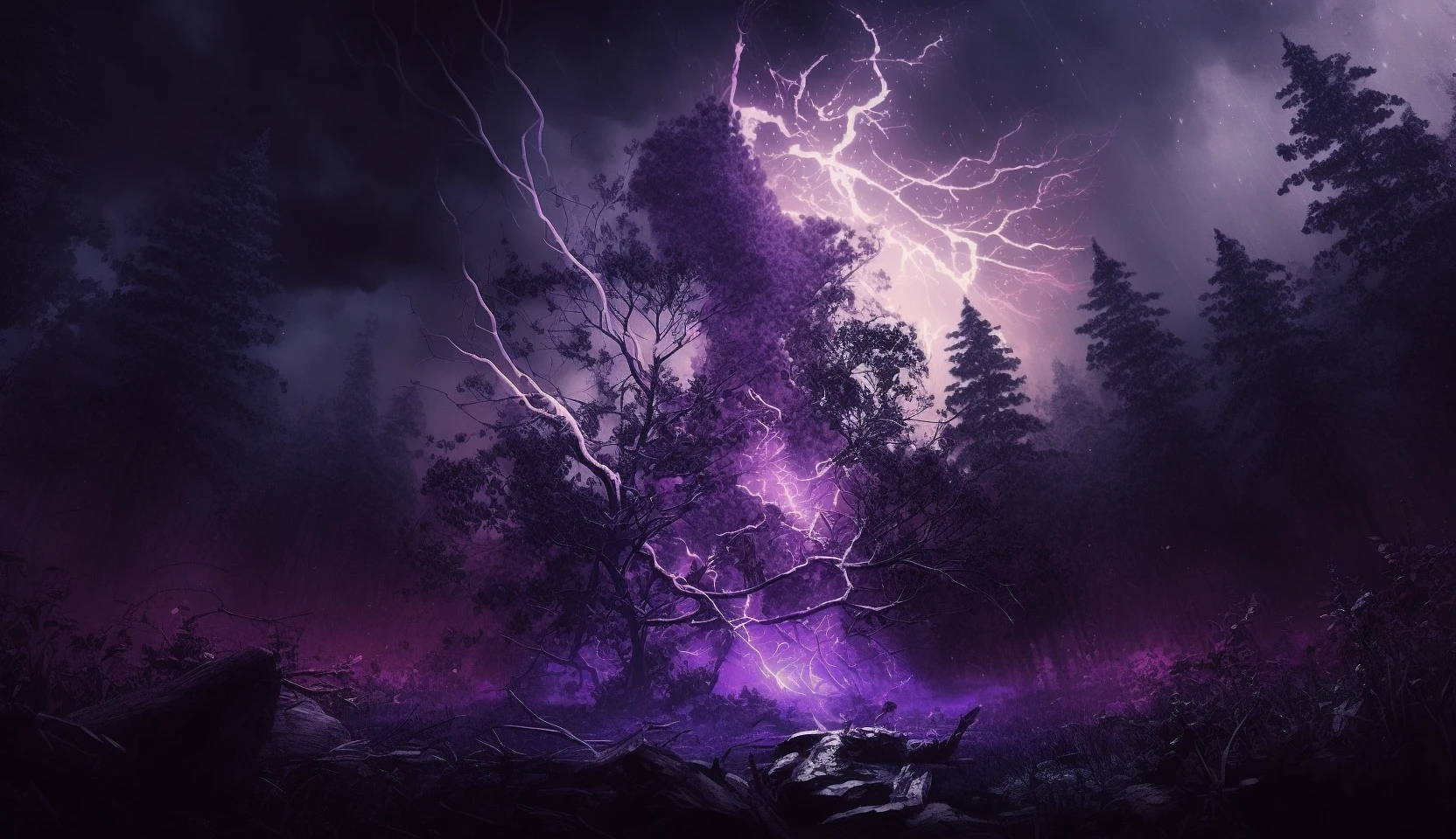 a blurred purple lightning large forest image for presentation, 8k, dark, cinematic, cinematic lights, highly detailed, photo realistic, blurred, extremely high details, ultra hd, hdr, RTX, Post Processing, Megapixel Cinematic lightning, ultra resolution, photography, --quality 2 --ar 16:9 --stylize 999