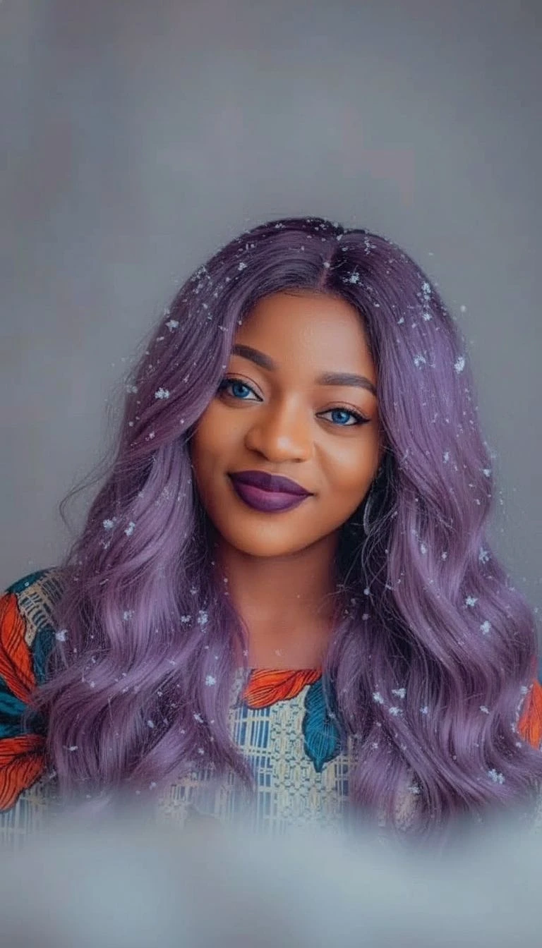 A close-up portrait of a person with wavy, lavender purple hair dusted with snowflakes, piercing blue eyes, and dark purple lipstick, set against a soft, muted grey background.
