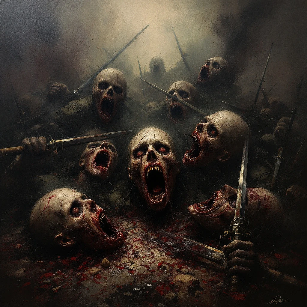 Create an award-winning digital oil painting in an expressionist style, capturing the raw terror and brutality of battle. The scene should be a chaotic, emotionally profound composition, drenched in dark, muted colors and framed by a gloomy, smoke-choked background. Show anguished, distorted faces mid-scream, torn bodies amidst twisted weapons, blood-soaked earth, and the horror in the eyes of the living as much as the dead. Use brutal, jagged brushstrokes and a moody, painterly texture to heighten the tension and despair. The composition should be very intricate, with layered imagery that draws the viewer in and leaves an indelible, haunting impression on the psyche. This is a masterpiece of horror and emotional weight, echoing the works of Otto Dix or Francisco Goya, yet rendered with modern digital finesse.